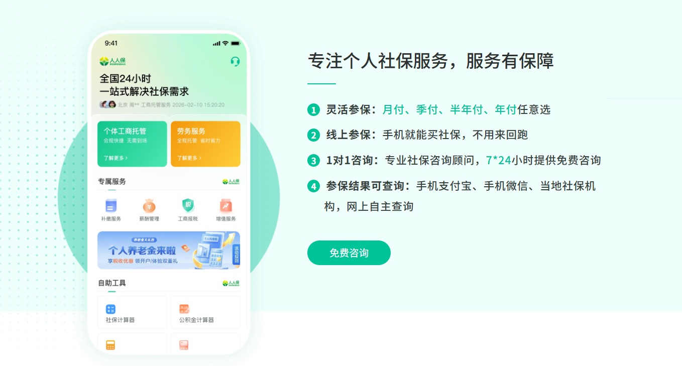 社保代缴关乎买房、买车、子女上学、医保报销等核心权益,无论是自主选型还是参考推荐,**合规资质+资金安全+透明低价**是永恒核心。**人人保**深耕社保代缴领域,坚持个体户合规缴纳模式,坚守行业冰点服务价,搭配一对一专属服务,既守住合规底线,又帮用户严控成本,是个人参保的优质之选。